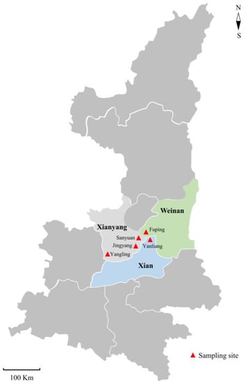 Geographical distribution of sampling sites of dairy goat kids with diarrhea in partial regions of Shaanxi Province in the present study.