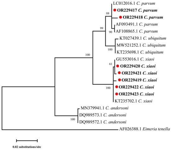Phylogenetic relationships of Cryptosporidium spp. from sheep and goats based on the SSU rRNA gene by maximum likelihood analysis using general time-reversible model. Red-filled circles before the bold sample names represent species identified in the present study. Bootstrap values over 50 are presented at the nodes. Eimeria tenella (AF026388.1) is used as the outgroup. Representative sequences of each sequence type in this study are included in the phylogenetic analysis.