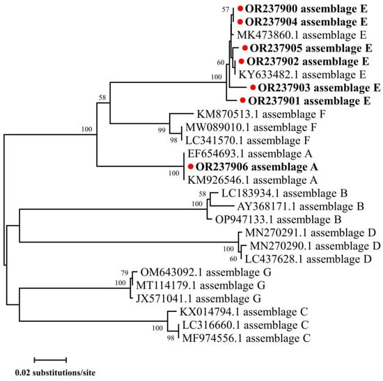 All positive secondary PCR products were sent to Sangon Biotech (Shanghai, China) for sequencing in both directions. The obtained sequences were assembled, edited and aligned using ChromasPro V1.33 (www.technelysium.com.au/ChromasPro.html (accessed on 15 June 2023)), BioEdit V7.04 (www.mbio.ncsu.edu/BioEdit/bioedit.html (accessed on 15 June 2023)) and ClustalX V2.1 (www.clustal.org/ (accessed on 15 June 2023)), respectively. To assess the relationships of Cryptosporidium spp., G. duodenalis and E. bieneusi found in the present study, three phylogenetic trees were constructed with the maximum likelihood (ML) method, a general time-reversible model and a bootstrap evaluation of 1000 replicates using MEGA V6.0 [].