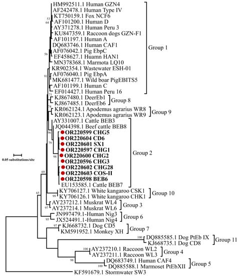 A sequence analysis based on the ITS gene locus of 112 E. bieneusi isolates revealed nine known genotypes (CHG3, CHG1, BEB6, CHG5, CHG2, SX1, CHG28, COS-II and CD6) in goat kids in the present study, and these genotypes have been previously reported in sheep and goats [,,,]. Among the identified genotypes in this study, CHG3 was the most common genotype, which was also found in goats from Henan, Yunnan, Anhui, Chongqing and Shaanxi, as well as in sheep in Henan []. BEB6 is a zoonotic genotype with a wide host range, including humans [], non-human primates [], bovines [], deer [], takins [], alpacas [], cats [] and birds []. Further phylogenetic analysis revealed that all nine genotypes belonged to the group 2. Although genotypes in the group 2 were reported to be ruminant-adapted at the beginning, more and more zoonotic genotypes identified in this group reflect an increasing risk of causing zoonotic infection between humans and animals [,].