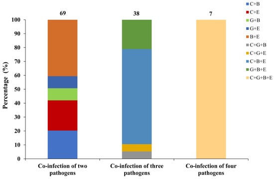 Percentage (%) of infection types within co-infections of two, three and four pathogens. C+B/C+E/G+B/G+E/B+E/C+G+B/C+G+E/C+B+E/G+B+E/C+G+B+E represent co-infection of Cryptosporidium spp. and E. bieneusi/Cryptosporidium spp. and E. coli/G. duodenalis and E. bieneusi/G. duodenalis and E. coli/E. bieneusi and E. coli/Cryptosporidium spp., G. duodenalis and E. bieneusi/Cryptosporidium spp., G. duodenalis and E. coli/Cryptosporidium spp., E. bieneusi and E. coli/G. duodenalis, E. bieneusi and E. coli/Cryptosporidium spp., G. duodenalis, E. bieneusi and E. coli, respectively. Numbers above bars denote sample size (n).