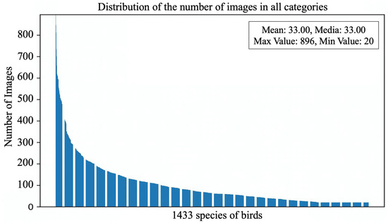 Overall distribution of the number of pictures of 1433 bird species in the GBDD1433-2023 dataset.