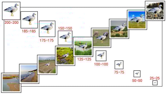To systematically evaluate the performance of existing object detection techniques in bird detection, we constructed two bird object detection performance test datasets: the multimodal bird object detection test dataset (MMBT) and the multi-object bird object detection test dataset (MOBT). In real-world applications, bird images not only have complex and diverse background scenes, but also exhibit variations in the scale of the foreground objects (birds) themselves. The MMBT dataset was designed to evaluate the sensitivity of object detectors to background noise and variations in the scale of foreground bird images. Through the use of image cropping and composition techniques, we created this dataset. During the construction of the MMBT dataset, we randomly selected high-resolution images of 200 bird species (one image per species) and generated foreground bird images at nine different pixel scales: 25 × 25, 50 × 50, 75 × 75, 100 × 100, 125 × 125, 150 × 150, 175 × 175, 185 × 185, and 200 × 200. Considering the possible scenarios where birds may appear, we selected 12 background scene images, including grasslands, tundras, shrubs, farmlands, and swamps (Figure A2), with a unified pixel scale of 224 × 224. Finally, we combined the different foreground bird images with the background scene images, resulting in a dataset of nearly 21,000 multimodal bird images (refer to the Figure 3).