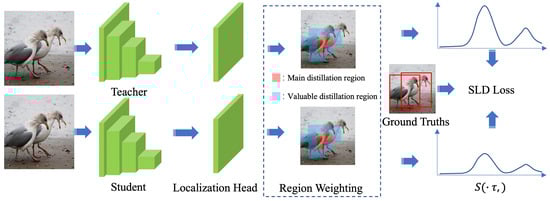 The confidence parameter C is composed of and , as shown in Formula (4), where denotes element-wise multiplication. The final Self-Adaptive Localization Distillation (SLD) loss function is obtained by multiplying the confidence parameter with the localization distillation function, as shown in the Formula (5). The overall training framework of SLD is illustrated in the Figure 5.