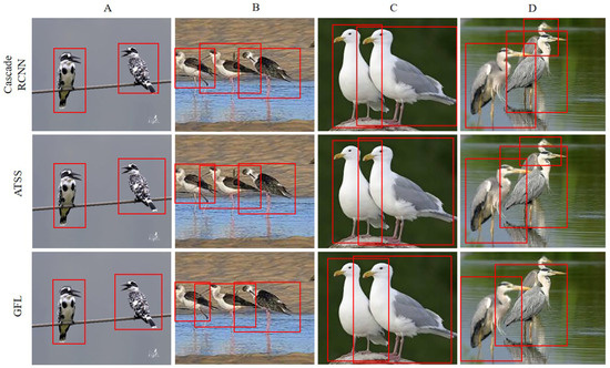 Finally, we further compare the visualization effects of three representative models, Cascade RCNN, ATSS, and GFL on the GBDD1433-2023 dataset (Figure 6). From the visual comparison, it can be observed that Cascade RCNN achieves the best object detection performance. However, when faced with bird occlusion (Figure 6D), it fails to detect the entire bird. ATSS exhibits similar visualization effects to Cascade RCNN, but it also struggles to detect the complete bird when occluded (Figure 6D), albeit with a smaller detection area compared to Cascade RCNN. GFL shows relatively poor visualization results as it fails to detect the occluded bird (Figure 6D).