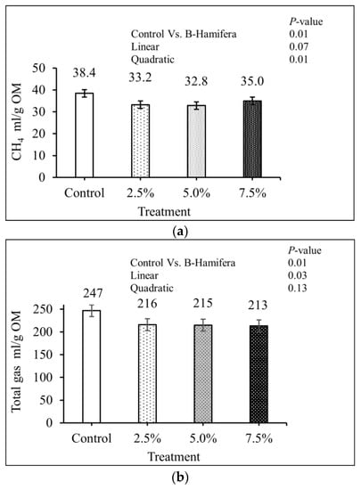 The inclusion of B. hamifera decreased (p = 0.01) predicted in vivo CH4 (Figure 1a) and total gas productions (Figure 1b). There was a quadratic effect (p = 0.01) of increased levels of B. hamifera on predicted in vivo CH4 production. The predicted in vivo total gas production linearly decreased (p = 0.03) due to higher total gas from control compared to the macroalga treatments.