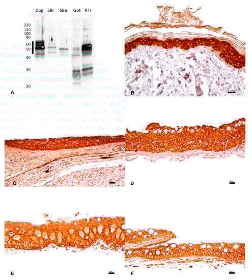 (A) Western immunoblotting of skin tissues incubated with the monoclonal anti-pan-cytokeratin antibody. Molecular weight markers are indicated on the left. The predicted molecular weight range of 45–65 kDa is indicated with a thick line. Dog tissue extract loaded as a positive control; SBr, sea bream; SBa, sea bass; GoF, goldfish; RTr, rainbow trout. (A–F). IHC shows strong and diffuse cytoplasmic immunostaining with accentuation of the cellular membrane in the squamous epithelium of the skin in the dog (B), sea bream (C), sea bass (D), goldfish (E), and rainbow trout (F). Bar: 20 µm.