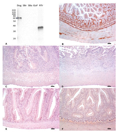 (A) Western immunoblotting of intestinal tissues incubated with the mouse monoclonal anti-vimentin antibody. Molecular weight markers are indicated on the left. The predicted molecular weight of 60 kDa is indicated with a thick line. Dog tissue extract loaded as a positive control; SBr, sea bream; SBa, sea bass; GoF, goldfish; RTr, rainbow trout. (B–F). IHC shows strong and diffuse cytoplasmic immunostaining of the intestinal mesenchymal cells of the dog (B), while no immunosignals were observed in sea bream (C), sea bass (D), goldfish (E), and rainbow trout (F). Bar: 5.0 µm.