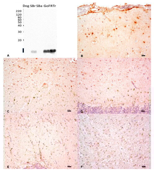 (A) Western immunoblotting of brain tissues incubated with the rabbit polyclonal anti-S100 protein. Molecular weight markers are indicated on the left. The predicted molecular weight of 10–12 kDa is indicated with a thick line. Dog tissue extract loaded as a positive control; SBr, sea bream; SBa, sea bass; GoF, goldfish; RTr, rainbow trout. (B–F). IHC shows a strong and diffuse cytoplasmic and nuclear expression in the dog (B), in sea bream (C), sea bass (D), goldfish (E), and rainbow trout (F). Bar: 20 µm.