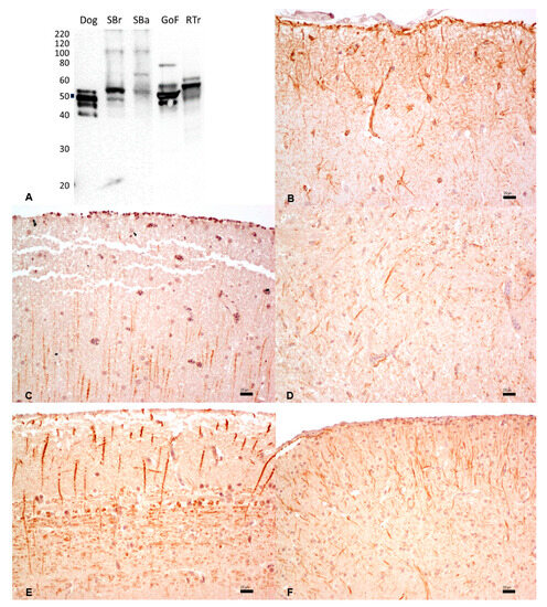 (A) Western immunoblotting of brain tissues incubated with the rabbit polyclonal anti-glial fibrillary acidic protein (GFAP). Molecular weight markers are indicated on the left. The predicted molecular weight of 50 kDa is indicated with a thick line. Dog tissue extract loaded as a positive control; SBr, sea bream; SBa, sea bass; GoF, goldfish; RTr, rainbow trout. (B–F). IHC shows strong and diffuse cytoplasmic staining in the dog (B), sea bream (C), sea bass (D), goldfish (E), and rainbow trout (F). Bar: 20 µm.