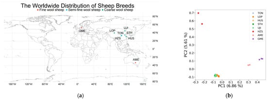 Blood samples were collected from eight sheep breeds (Table 1), including Australian Merino sheep (AME), German Mutton Merino sheep (GME), Tong sheep (TON), Hanzhong sheep (HZS), Lop sheep (LOP), Hu sheep (HUS), Small Tailed Han sheep (STH), and Ujimqin sheep (UJI), using jugular vein blood collection. Sequencing libraries were generated using the Truseq Nano DNA HT Sample Preparation Kit (Illumina, San Diego, CA, USA). The whole genomes of the 28 sheep were sequenced on the Illumina Hiseq 2000 platform. The resequenced data were used for subsequent analysis.