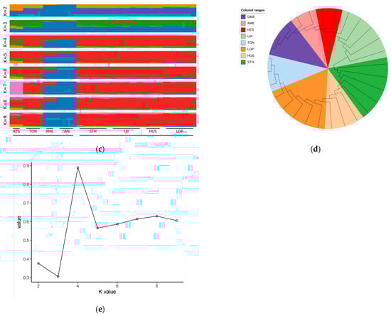 World distribution map of sheep breeds and population genetic structure analysis: (a) World distribution map of sheep breeds; (b) Principal component analysis (PCA); (c) Population structure analysis (different colors represent different components of ancestry); (d) Phylogenetic tree (N-J tree); (e) Cross-validation error.
