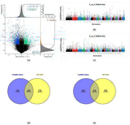 Selection signal analysis: (a) Fst and θπ Ratio selection elimination analysis plots; (b) Genome-wide distribution of XP-EHH (F vs. C); (c) Genome-wide distribution of XP-EHH (C vs. F); (d) Fst and θπ Ratio and XP-EHH screened for overlapping genes (F vs. C); (e) Fst and θπ Ratio and XP-EHH screened for overlapping genes (C vs. F).