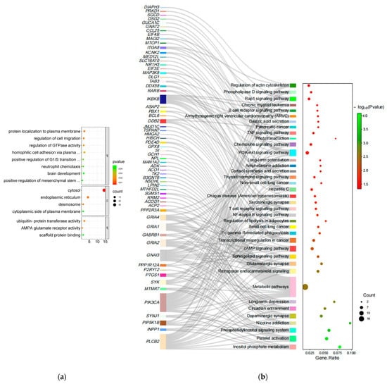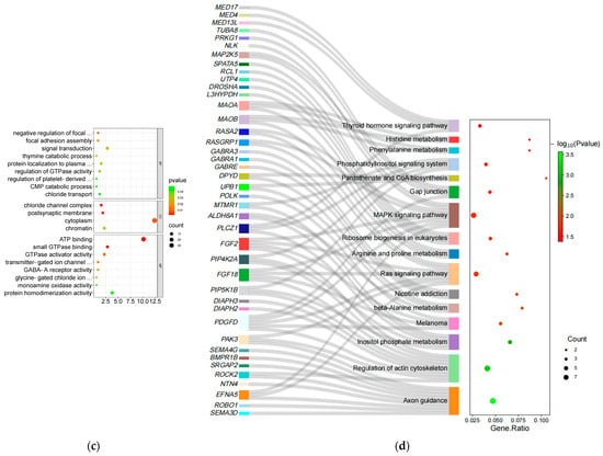 Then, in the fine wool trait (F vs. C), 38 significant KEGG enrichment pathways were identified (p < 0.05, Figure 3b, Supplementary Table S9), including Regulation of actin cytoskeleton (oas04810, ITGA8, PIP5K1B, PIK3CA, PPP1R12A, and DIAPH3), Phosphatidylinositol signaling system (oas04070, PLCB2, INPP1, PIP5K1B, SYNJ1, PIK3CA, and MTMR7), Regulation of lipolysis in adipocytes (oas04923, PIK3CA, PTGS1, and GNAI3), Sphingolipid signaling pathway (oas04071, PIK3CA, PLCB2, PPP2R3A, GNAI3, and SGMS1), Cortisol synthesis and secretion (oas04927, PLCB2, KCNK2, and PBX1), and PI3K-Akt signaling pathway (oas04151, ITGA8, SYK, PIK3CA, PPP2R3A, MTCP1, IKBKB, MAGI2, and EIF4B). In the coarse wool trait (C vs. F), KEGG pathway enrichment analysis identified 16 significant KEGG enrichment pathways (p < 0.05, Figure 3d, Supplementary Table S10), including Axon guidance (oas04360, SEMA3D, ROBO1, EFNA5, NTN4, ROCK2, SRGAP2, BMPR1B, SEMA4G, and PAK3), Regulation of actin cytoskeleton (oas04810, PDGFD, DIAPH2, DIAPH3, PIP5K1B, ROCK2, FGF18, PIP4K2A, FGF2, and PAK3), MAPK signaling pathway (oas04010, RASGRP1, PDGFD, EFNA5, FGF18, MAP2K5, NLK, FGF2, and RASA2), Arginine and proline metabolism (oas00330, MAOB, MAOA, and L3HYPDH), beta-Alanine metabolism (oas00410, UPB1, ALDH6A1, and DPYD), Pantothenate and CoA biosynthesis (oas00770, UPB1, and DPYD), Phenylalanine metabolism (oas00360, MAOB, and MAOA) and Gap junction (oas04540, PRKG1, TUBA8, PDGFD, and MAP2K5).