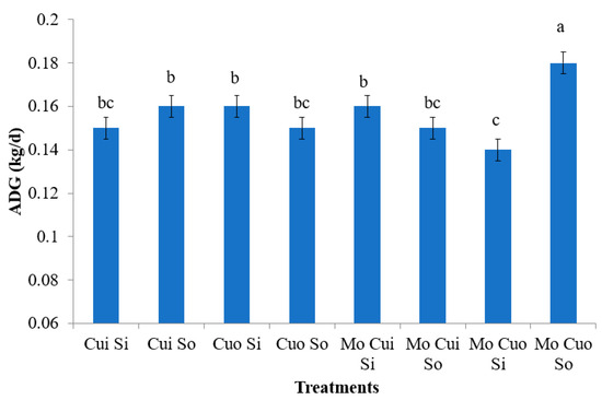 No significant treatment effects were observed on body weight measurements (p > 0.05; Table 3); however, the ADG was affected by the Mo, Cu source, and S source interaction (p = 0.0283; Table 4 depicted in Figure 1). Also, BW and the ADG were significantly influenced by the time (p = 0.0001 and p = 0.0014, respectively; Table 3 and Table 4). Mineral supplementation did not significantly affect the carcass traits (p > 0.05; Table 5).