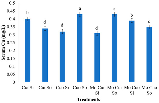 The serum concentration of Cu was higher in the control group compared to the other treatments; otherwise, serum Cu levels decreased when supplementing Mo and through the Mo × Cu × S interaction. As previously mentioned, excessive dietary Mo and S may impair Cu absorption through insoluble thiomolybdates and sulfides, formed by ruminal microbes [5,6,10]. This can lead to reduced Cu levels in the liver and eventually reduced plasma Cu concentrations as a consequence [3]. Lower serum Cu concentrations were detected, in this present study, in the Mo-supplemented group compared to the other groups, confirming the negative effect of Mo on Cu absorption in bloodstream. Corroborating this, Dias et al. [25], in their meta-analytical study, found reduced plasmatic Cu concentrations as increasing levels of Mo and S were supplemented into the diet of growing-finishing cattle. Further, Suttle [31] observed reduced serum Cu concentrations by increasing S levels in sheep diets, both in organic and inorganic form. A similar reduction was found in sheep when including high S levels, which increased the concentration of sulfides in ruminants [32]. In this study, all treatments were composed of either Mo or S inclusion, except for the control group, which encompassed, in this study, a higher serum Cu concentration. Thus, Cu absorption, even due to its higher level of supplementation, may be jeopardized by the Mo and S interaction, reflecting in lower serum Cu concentrations.