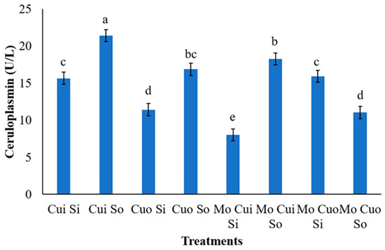 In addition to the negative impacts of Mo and S on Cu tissue uptake, it has also been reported in sheep that dietary Mo plus S affect another critical step of Cu metabolism—its utilization for ceruloplasmin synthesis in the liver [13]. Ceruloplasmin is a copper–protein complex found in blood responsible for Cu transport, binding up to 95% of this circulating mineral [14]. Consequently, this complex may be an indicator of serum Cu concentration in ruminants [15]. Furthermore, ceruloplasmin is an acute-phase protein that increases during infection or acute stress, being an important substance for animal survivability [14].