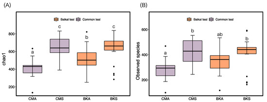 The alpha diversity indices: Chao1 (A) and Observed species (B) were compared among the CMA, CMS, BKA, and BKS groups. Significant differences at p < 0.05 are denoted by lowercase letters and the black dots show the extreme values.