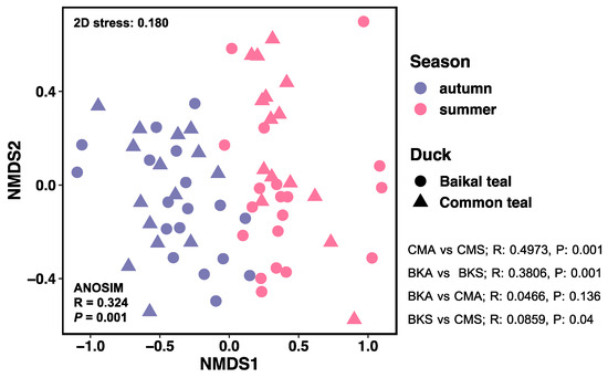 Non-metric multidimensional scaling (NMDS) plot using Bray–Curtis dissimilarity distances for fungal community composition between samples from two host species across two seasons (stress = 0.180). Samples from autumn are denoted by the color purple, while samples from summer are represented by the color pink. The host species are distinguished by the following symbols: circles for Baikal teal and triangles for common teal.