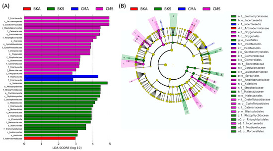 In order to investigate the detailed differences in gut fungal biomarkers between the two seasons in the two duck species, LEfSe analysis was conducted at the phylum to family level. This analysis aimed to identify potential biomarkers in the four identified groups. Using a logarithmic LDA (linear discriminant analysis) size effect value of 2.0, a total of thirty-eight fungal assemblages were identified as significant (Figure 3A). The cladogram visualization displayed distinct patterns. The family Incertaesedis was found to be more abundant in the CMA group, while the family Arthrodermataceae was more prevalent in the BKA group. At the order level, Onygenales, Saccharomycetales, Glomerellales, and Xylariales were more abundant in the CMS group. The orders Helotiales, Sordariales, Incertaesedis, Mortierellales, and Mortierellales were found to be more abundant in the BMS group (Figure 3B).