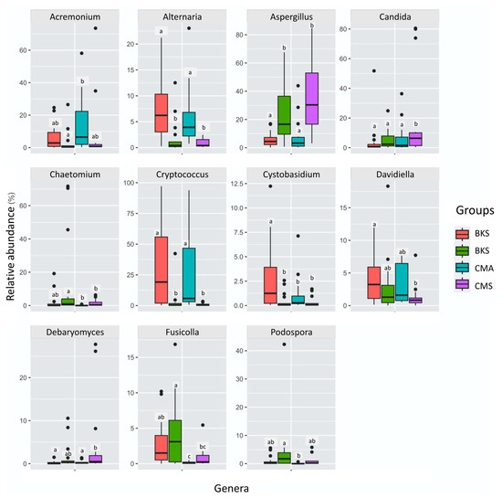 One-way ANOVA with Duncan’s post hoc test showed significant differences in relative abundance across groups at the genus level. Small letters are used to indicate significant differences at p < 0.05. The whiskers extended from the box to the minimum and maximum values and the black dots show the extreme values.