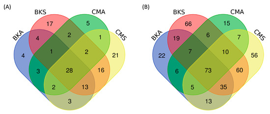 In the analysis of the samples, a total of 5,031,421 quality-filtered fungal sequences were obtained. A total of 1880 distinct fungal OTUs were identified, with the number of OTUs varying from 71 to 413 across all samples. Among these OTUs, 437 (23.24% of the total) were found to be shared for all four groups studied: common teal in autumn (CMA), common teal in summer (CMS), Baikal teal in autumn (BKA), and Baikal teal in summer (BKS). The unique gut fungal OTUs for each group were as follows: 98 for CMA, 240 for CMS, 134 for BKA, and 273 for BKS (Figure S1, Supplementary Materials).