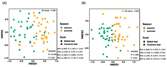 A non-metric multidimensional scaling (NMDS) analysis was performed to investigate the inter-individual differences between groups. The main objective of the NMDS analysis was to examine the separation and clustering patterns of samples. The results revealed a clear separation between the two seasons, indicating that the fungal community composition varied significantly between summer and autumn for both hosts. However, no distinct separation was observed between the duck species (Figure 2).
