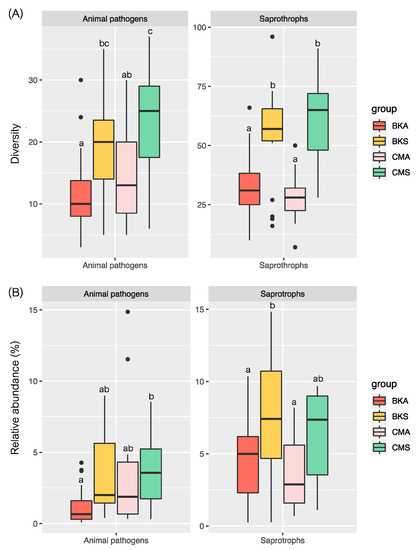 The diversity and relative abundance of animal pathogen and saprotroph fungal communities between two seasons in two duck species; (A) diversity and (B) relative abundance, based on the non-parametric with Duncan test. Significant differences at p < 0.05 are denoted by lowercase letters and the black dots show the extreme values.