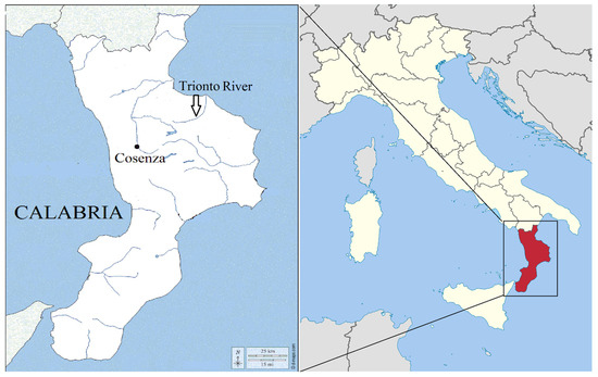 Fish were collected in the Trionto River, in the municipality of Longobucco (Cosenza province of Calabria region in Southern Italy) (Figure 1). The Trionto River with a length of about 40 km arises in the province of Cosenza, from the mountains of the Sila National Park, and flows east, entering the Ionian Sea. This site has long suffered from inadequate urban waste disposal (including illegal dumps or not compliant landfills located very close to riverbeds), inefficient wastewater treatment plants, and the presence of some areas of concern for environmental remediation, including a National Interest Site (Rapporti ISTISAN 16/9).