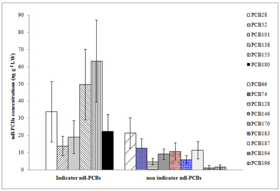 Regarding the non-indicator ndl-PCBs, the tetra-chlorinated PCB 66 was detected with the highest mean concentration (21.56 ng g−1 LW), accounting for 7.6% of Σ15ndl-PCBs, while the PCBs Nos. 194 and 196 were detected with the lowest ones (1.30 and 1.56 ng g−1 LW, respectively). The latter two congeners were found in 65% of sample units; other non-indicator ndl congeners were in all sample units.