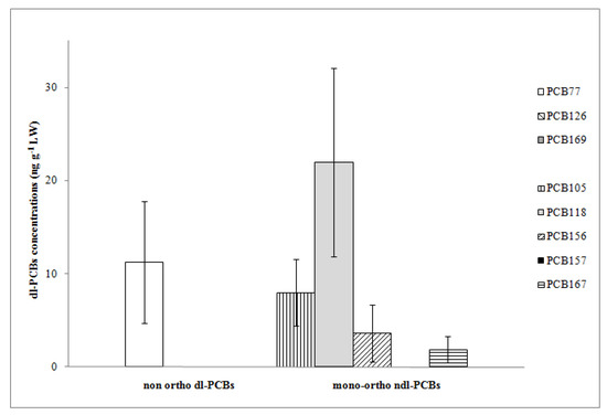 Regarding dl-PCBs, Σ5dl-PCBs were higher than Σ3dl-PCBs (mean value of 35.44 ng g−1 LW vs. 11.30 ng g−1 LW) (Table 1). Among non-ortho congeners, PCBs Nos. 126 and 169 were never detected (Figure 3); therefore, the concentration of Σ3dl-PCBs is only due to PCB 77 (mean value of 11.28 ng g−1 LW and detection in 83% of sample units). Four out of five mono-ortho PCBs were detected; in particular, in all sample units, we found PCB 105 and PCB 118 (mean values 7.99 and 21.96 ng g−1 LW, respectively). The latter congener showed the highest concentration among dl-PCBs and contributed 62% to Σ5dl-PCBs. PCB 156 and PCB 167 had relatively low mean concentration levels (3.63 and 1.86 ng g−1 LW) (Figure 3); they were detected in 69% and 78% of the sample units, respectively. The congeners PCB 118, PCB 77, and PCB 105, recognized as more toxic and usually detected at lower concentrations than ndl ones [45], were instead found at mean concentrations roughly comparable to those of some indicator and non-indicator ndl-PCBs (i.e., PCB 52, 101, 180, 66, 74).