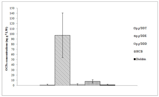 Mean concentrations and standard deviation of OCPs expressed as ng g−1 on lipid weight basis (LW).
