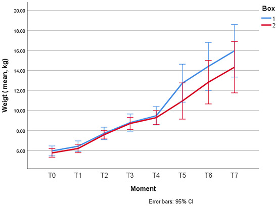At time T0, upon arrival of the animals to the facilities, the mean total weight was 5.854 ± 1.1165 (SD) kg. The comparison between the means of the groups revealed no significant differences at the beginning of the experiment (5.958 ± 1.1777 (SD) kg in Box 1 vs. 5.758 ± 1.0711 (SD) kg in Box 2), being the two batches initially comparable in terms of weight.