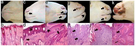 Severity grade of gross and microscopic ORFV-associated lesions. Grade 0 is classified as the absence of macroscopic (a) and microscopic (b) lesions. Grossly, grade 1 shows a low number of vesicles (arrow) or papules (c). Histologically, mild multifocal lymphoplasmacytic dermatitis (arrow) admixed with acanthosis and epidermal vesicles (arrowhead) are seen (d). Grade 2 is characterised by a higher number of papules and pustules (arrows) (e). Histology reveals moderate multifocal to coalescing dermatitis (arrowhead) admixed with marked acanthosis, parakeratotic hyperkeratosis (thin arrow) and epidermal pustules (arrow) (f). Grade 3 is composed of multifocal scab formations (arrow) with scattered pustules (arrowhead) (g), microscopically characterised by severe acanthotic proliferative dermatitis (arrows) (h). In grade 4, scabby proliferative dermatitis (arrows) starts to expand (i,j). Grade 5 shows multifocal to coalescence scabby proliferative and necrotising dermatitis (k), histologically observed as a total loss of skin architecture, replaced by lymphoplasmacytic and neutrophilic infiltrate (arrow) and haemorrhages (thin arrow) (l).