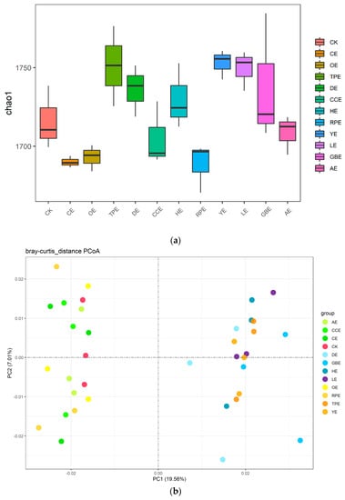 The methodology employed in this study involved the utilization of 16S rRNA sequencing to assess both the abundance and structure of the microbiome in response to the various therapies. The effects of eleven different types of Chinese herbal extracts on the microbial diversity and relative abundance in the fermentation broth in vitro are shown in Figure 6. The alpha diversity of the microbial community in the cecum of laying hens was represented by the chao1 index. The chao1 index reflects the abundance of species in a sample, that is, taking into account only the number of species in the sample rather than the abundance of each species in the sample. Compared with the control group, TPE, YE, and LE significantly increased the number of the chao1 index (p ≤ 0.05). The bacterial microbiota composition differed between different processing groups, as shown by the principal coordinates analysis (PCoA) plot (Figure 6b).