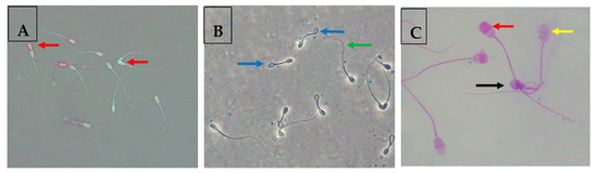 In the same scope, the number of sperm cells with abnormal tail morphology (coiled tail, broken tail, terminally coiled tail, double tail) and head morphology (microcephalic head, pear-shaped head, round short head, loose head, double head) was also recorded (as percentages), as previously described [34].
