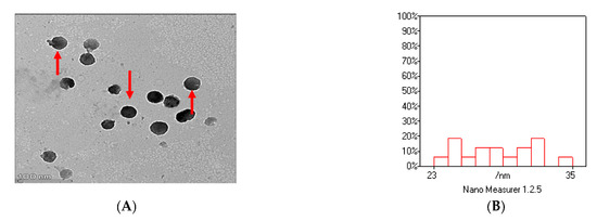 The characterization of TQNPs through TEM (A) shows a spherical morphology (red arrows) with a good size distribution (B). The nanoscale of TQNPs (C), and the zeta potential distribution of TQNPs is −32.5 (D).