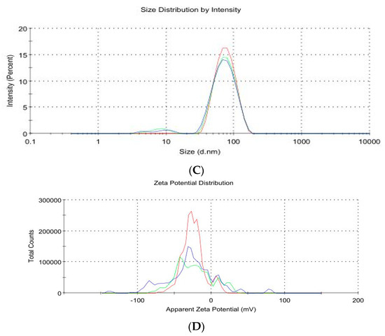 TQNP average vesicular sizes (Z-average), surface charge, and polydispersity index (PDI) were determined using a Zetasizer Nano ZS analyzer (Malvern Instruments, Malvern, UK) and the dynamic light scattering (DLS) technique. After adequate dilution with DW at 25 °C, the freshly prepared formula was tested in triplicate. The TQNP surface charge, expressed as zeta potential (ZP), which detects the vesicle’s electrophoretic mobility in an electric field, was measured in triplicate using the same apparatus and DW dilution as described in the previously mentioned Z-average measurement.