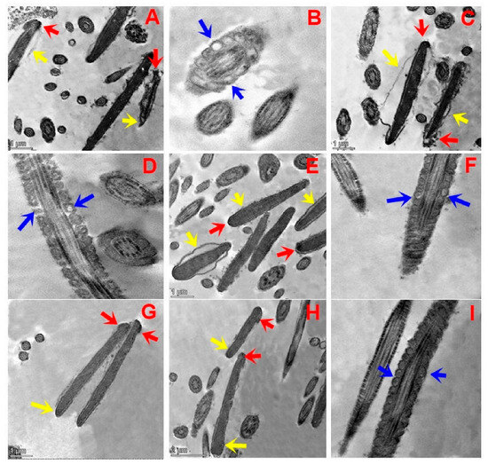 Transmission electron microscopy (TEM) micrographs of post-thawed buffalo sperm in groups treated with 0, 12.5, 25, 37.5, or 50 µg/mL of TQNPs. Control (A,B) and TQNP12.5 (C,D) groups exhibited different stages of damage in the sperm nucleus after the freezing–thawing process, whereas (A,C) indicates that the sperm plasma membrane was swollen and degenerated completely (yellow arrow). In addition, the acrosomal cap was damaged, and acrosomal material diffusion into the formed space was also noticed (red arrow). The longitudinal section of the medial fragments reveals abnormally vacuolated mitochondria in sperm and the absence of crystals ((B,D); blue arrow) in control and TQNP12.5. In other treated groups, TQNP25 (E,F), TQNP 37.5 (G), and TQNP50 (H,I), it exhibits numerous sperm cells with normal nucleus and homogenous condensed chromatin surrounded by intact plasma membrane (yellow arrow), and regular acrosome (red arrow). Additionally, mitochondria were regularly placed in longitudinal sections in all treated groups (TQNP25- TQNP50).