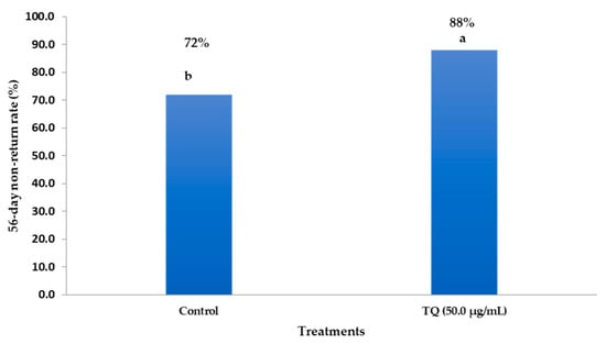 The impacts of inseminated semen supplemented with TQNPs at level of 50 µg/mL on the 56-day non-return rate in buffalo cows. a,b Values of the same column with different superscripts are significantly different (p < 0.05).