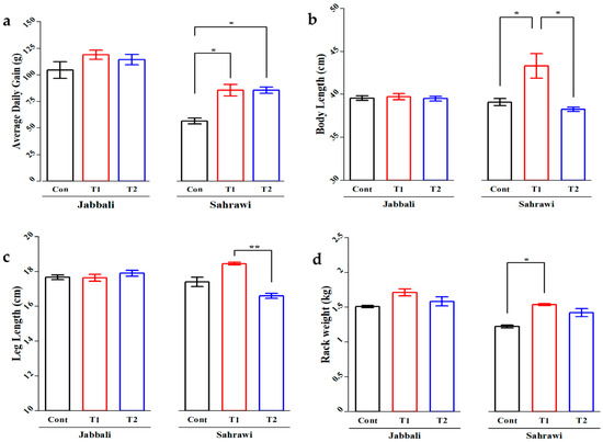 The effects of SP on (a) average daily gain (g), (b) body length (cm), (c) leg length (cm), and (d) rack weight (kg) of Jabbali and Sahrawi Omani goat breeds. The data are shown as least square means and standard errors. p < 0.05 is consider as significant. The * represents p < 0.05 and ** represent p < 0.01.