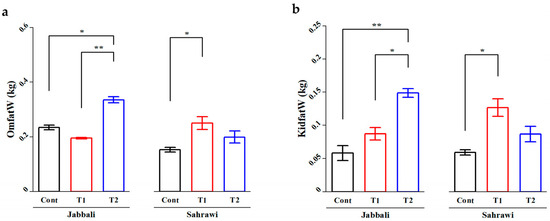 There were also no breed differences (p > 0.05) for all non-carcass components except for omental and kidney fat weights of both breeds and heart and kidney weights of Jabbali bucks (Table S2). The weights of omental and kidney fat were significantly increased by SP compared to CON in both breeds (Figure 2a,b). The weights of the heart (0.36 ± 0.27 g) and kidney (0.29 ± 0.21 g) were significantly higher in CON compared to both SP groups (0.09 ± 0.01 and 0.06 ± 0.01) of the Jabbali breed, respectively.