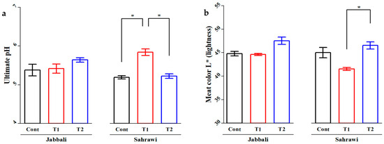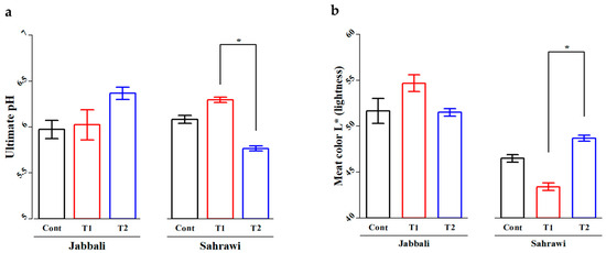 The SP effects on (a) ultimate ph and (b) meat color (L* lightness) of longissimus dorsi in Jabbali and Sahrawi breeds. The data are shown as least square means and standard errors. p < 0.05 is consider as significant. The * represents p < 0.05.
