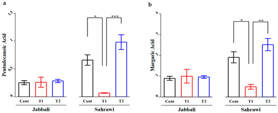The fatty acid profiles of the LD muscle for Jabbali and Sahrawi bucks fed SP are presented in Table S5. Some saturated fatty acids (C24:0), monounsaturated fatty acids (C16:1), and polyunsaturated fatty acid (C20:3n6) of the LD in Jabbali bucks showed significant differences from diets supplemented with SP. However, most saturated fatty acids (Sfa) except (C16:0 and C20:0), monounsaturated fatty acids (Mufa), polyunsaturated fatty acids (Pufa) except (C20:3n6), Pufa n-6, and Pufa n-3 and n-6/n-3 ratio of the LD in Sahrawi bucks showed significant differences to diets supplemented with SP (p < 0.05). In addition, the LD of Sahrawi goats fed diets supplemented with the SP of the T1 group (0.07 ± 0.01 and 0.49 ± 0.23) had significantly decreased (p < 0.05) amounts of pentadecanoic (C15:0) and margaric (C17:0) acids compared to the T2 (0.98 ± 0.26 and 2.52 ± 0.59) and CON (0.66 ± 0.19 and 1.91 ± 0.54, respectively) (Figure 5a,b).