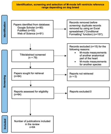 This review was conducted based on reference values obtained from M-mode echocardiography of the left ventricle (LV) for 44 different dog breeds as reported in the scientific literature from three databases. We identified scientific articles through Google Scholar, PubMed, and Web of Science. We conducted systematic searches using the keywords “dog”, “left ventricle”, and “M-mode”, following the protocol in Figure 1, resulting in the consideration of 64 different papers. The data included information on the dogs’ ages, sexes, and sedation status during the echocardiography examination. Additionally, the LV dimensions measured in millimeters were considered, including interventricular septum in diastole (IVSd), left ventricular internal diameter in diastole (LVIDd), left ventricular posterior wall in diastole (LVPWd), interventricular septum in systole (IVSs), left ventricular internal diameter in systole (LVIDs), and left ventricular posterior wall in systole (LVPWs).