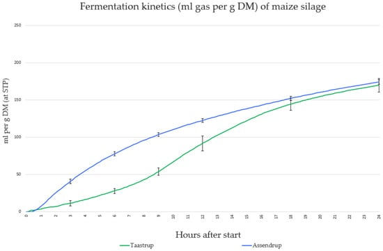 The human population is continuously expanding, which increases the demand for meat and milk from the cattle industry. FAO estimated an increase of 73% and 58% for meat and milk, respectively, from 2010 to 2050, which means an increase in greenhouse gas emissions []. This was supported by IFCN, who forecasted that milk production will increase by 35% from 2017 to 2030 []. Gerber et al. reported that livestock production contributes to approximately 14.5% of the total anthropogenic greenhouse gas emission, and enteric fermentation contributes to 39.1% of the total emission from this sector []. Another report by Opio et al. asserts this notion that, within the livestock sector, dairy cattle account for roughly 30% of the methane (CH4) emission []. An amplification of the cattle production is therefore of concern. To ensure that ruminant CH4 emission is minimized, a high-quality feed, which ensures meeting nutritional requirements, is crucial []. Conserved forages provide stable nutrition and are therefore widely used in countries with restricted growing seasons, such as Denmark. Maize silage (MS) is used not only in the Nordic countries but also used for all ruminant species worldwide [,]. MS is, therefore, an important component for ruminant diets to ensure nutritional fodder; hence, this feed has been used as one of the basal feed samples for all fermentations conducted in Denmark in the last decade. To ensure that MS and other fodder meet animal nutritional requirements, feed evaluation is necessary.