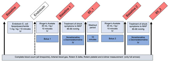 After baseline cardiovascular measurements and blood sampling, endotoxemia was induced with 1 mg/kg E. coli lipopolysaccharide (LPS) (LPS endotoxin O111:B4; Sigma-Aldrich, Taufkirchen, Deutschland) administered IV over 10 min (Figure 1). Directly after the measurement of macro- and microcirculatory measurements and a CBC, the first phase of fluid resuscitation consisted of 30 mL/kg intravenous administration of RA administered over 30 min. Afterwards, hypotension was treated by titrating IV noradrenaline infusion (Noradrenaline Sintetica, Sintetica) with a 0.0005 mg/kg/minute IV starting dose with or without a 0.0005 mg/kg/h fixed-dose IV dexmedetomidine (Dexdomitor, Provet AG, Lyssach, Switzerland) infusion to reach a mean arterial pressure of 85 to 90 mmHg. Both infusions were stopped thereafter, and when the cardiovascular values had deteriorated after a 10 min washout phase, the fluid resuscitation and vasopressor treatment trial was repeated with or without dexmedetomidine to reach a mean arterial pressure of 85 to 90 mmHg. The dexmedetomidine was given in a randomized blinded manner crossover design to all animals either before 85_1 or before 85_2. All dogs received both treatments.
