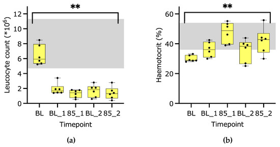 Leucocyte count (reference interval 4700–11,300/µL) decreased (p < 0.01) from 5940 (5230–8490)/µL) to median values of <2000/µL during all other timepoints (p < 0.01) (Figure 2a). The hematocrit (reference interval in awake animals: 36–54%) increased (p < 0.01) from a baseline value of 29 (28–33) % to maximal values of 49 (39–55) % at timepoint 85_1 (Figure 2b).