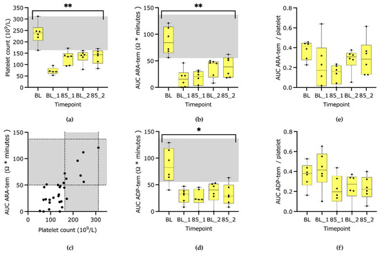 Box-plot graphs of platelet count (a), area under the curve (AUC) of arachidonic acid-activated (ARA)-tem (b) and their correlation (c), AUC Adenosindiphosphat-activated (ADP)-tem (d), AUC ARA-tem/platelet (e) and AUC ADP-tem/platelet (f) analyzed at baseline (BL), baseline 1 (BL_1), mean arterial blood pressure 85–90 mmHg (85_1), baseline 2 (BL_2) and 85_2. * marks a p-value < 0.05, ** <0.01, and the grey area marks the reference interval. The data for AUC/platelet were not analyzed statistically.
