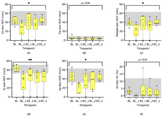 Box-plot graphs of Ex-tem maximum clot firmness (MCF) (a), Fib-tem MCF (b), Platelet -tem (Ex-tem–Fib-tem) MCF (c), In-tem MCF (d), Ap-tem MCF (e) and Ex-tem maximum lysis (ML) (f) analyzed at baseline (BL), baseline 1 (BL_1), mean arterial blood pressure 85–90 mmHg (85_1), baseline 2 (BL_2) and 85_2. * marks a p-value < 0.05, ** <0.01, and the grey area marks the reference intervals.
